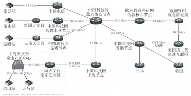 e-VLBI技术在国际上发展迅速,1975年,在美国和加拿大之间通过卫星通信开展了数据速率为20Mbit/s的首次实时e-VLBI试验。2000年以后,美国、日本和欧洲均进行了e-VLBI实验,技术和应用水平领先。中国VLBI网是由中国科学院上海天文台牵头建设,由五站一中心组成,包括上海佘山站25米和天马站65米射电望远镜、北京密云站50米射电望远镜、云南昆明站40米射电望远镜、新疆乌鲁木齐南山站25米射电望远镜,以及位于上海松江的VLBI数据处理中心。2007年,欧洲、澳大利亚和中国联合进行首次跨越三大洲256Mbit/s 速率的e-VLBI试验演示,并通过JIVE相关处理机实时获得清晰条纹。这是中国VLBI网观测站首次参加国际e-VLBI 观测。