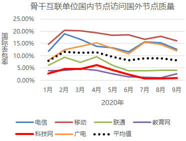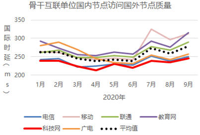 中国科技云提供“网络接入”服务,拥有多条高速国际科研出口,可以为科研用户提供大带宽、高网速科研传输服务,组织和推动多学科交叉的应用开发资源共享,高性能的网络设备和专业的7×24小时运维队伍,保障用户访问畅通,网络运行安全、稳定,海量科研数据传输顺畅。在工信部提供的《信息通信网络运行质量工作简报》中,给出了2020年1—9月期间,骨干互联单位国内节点访问国外节点的质量情况(图3和图4)。