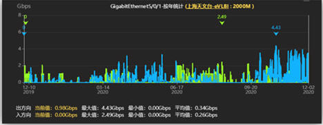 2020年,中国科技云继续为e-VLBI提供网络支持同时,面对中国科学院上海天文台与西澳大利亚州的默奇森射电天文台(图5)之间就SKA先导项目开展合作,需要海量数据的高速多线程传输实际需求,中国科技云团队积极响应,全力提供支持,在跨洲际数据传输过程中,上传峰值达到2.49Gbps,下载峰值达到4.43Gbps,达到了很好的传输效果(图6)。