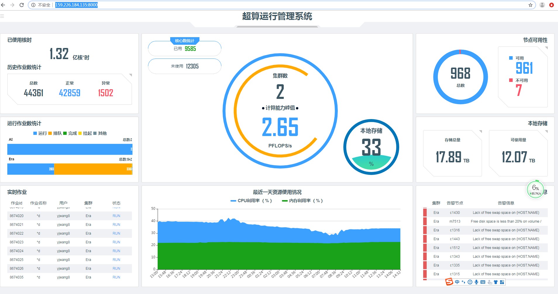 实现对怀柔超算AI和Era两个集群的运行状态、资源使用情况、作业情况、负载情况等统一管理和展示: