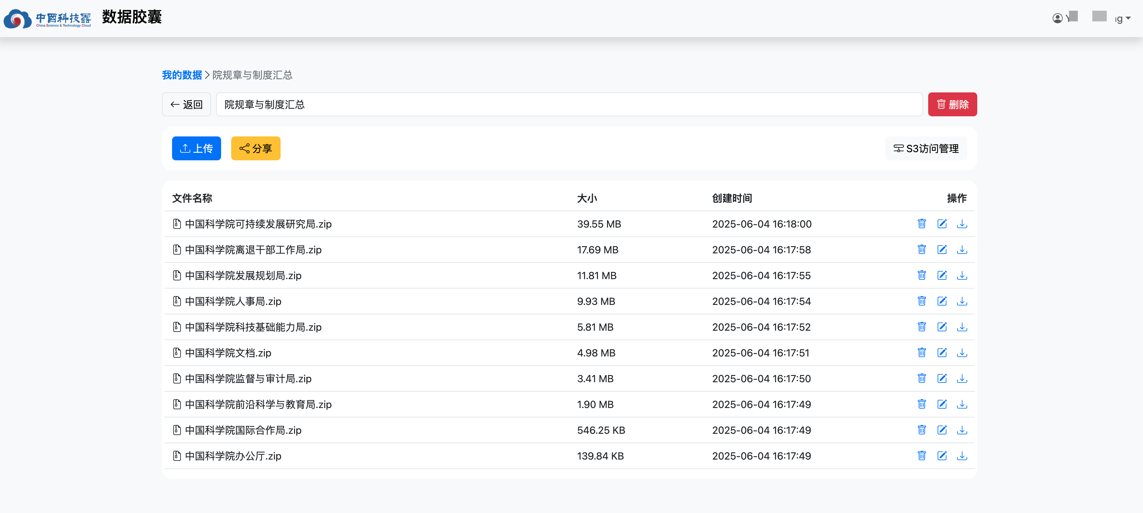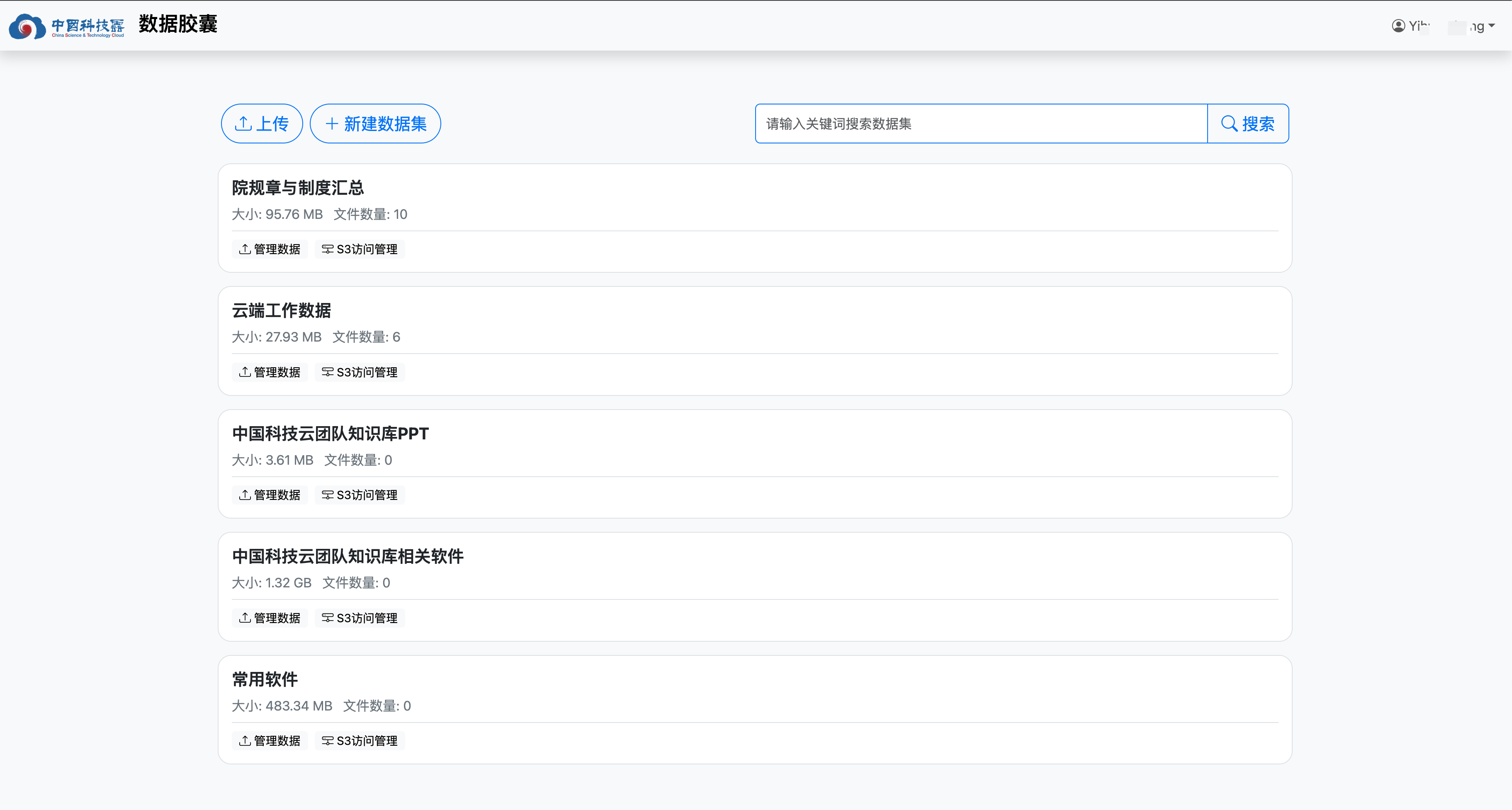 中国科技云数据胶囊面向科研人员提供面向云端科研与协作的数据管理服务。用户登录后,即具有独立专属数据空间,用户可自由创建数据集,并通过Web、S3客户端等上传、下载数据,实现数据从本地到云端的自由流转,更可通过S3接口,使用云端的软件访问数据,轻松开展云端科研计算、分析等业务,提升数据使用水平与用户体验。