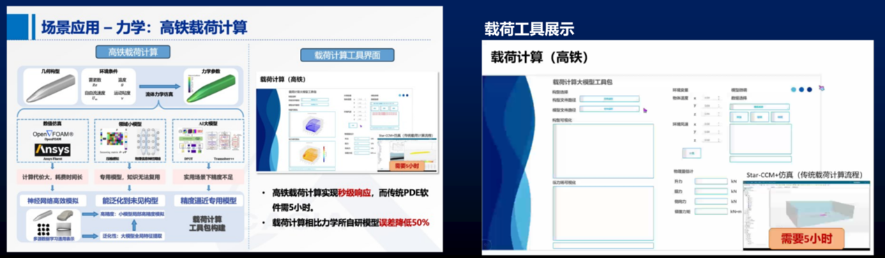 基于磐石-科学工具调度台强大的科学数据理解和预测能力,我们研发了高铁载荷计算工具,能够计算高铁模型在多种流体环境下的表面压力场,为构型设计提供数据支持。系统输入是一个三维构型以及流体环境,比如环境风速,输出是表面压力场和多种关键参数,比如阻力、升力、侧向力等。这个应用的关键瓶颈就是计算速度,传统的 PDE 求解工具计算一次表面通常需要耗费约 5 小时,而我们的工具仅需 10 秒即可相应。同时,在精度方面,相较于其它 AI 模型,该工具误差降低了 50%。该高铁载荷计算工具能够显著提升高铁空气动力学的计算效率,大幅缩短高铁的设计周期。