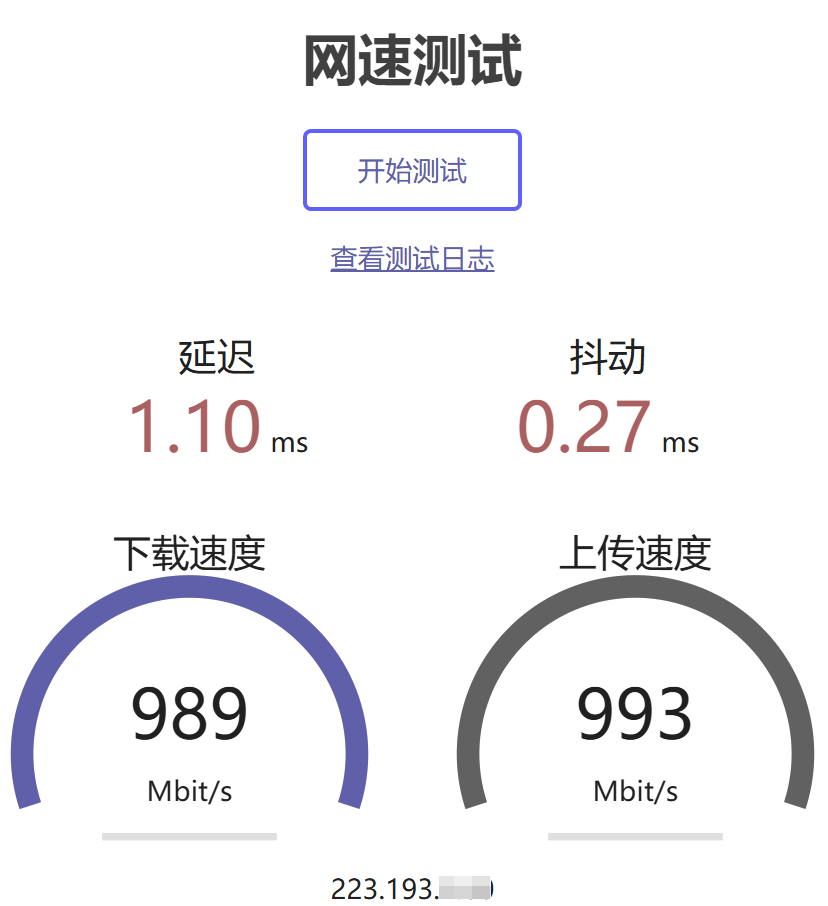 "网速测试"页面清晰明了,直接显示当前使用的IP地址,网络上传、下载速度,网络延迟、抖动情况,还可查看网络测速日志