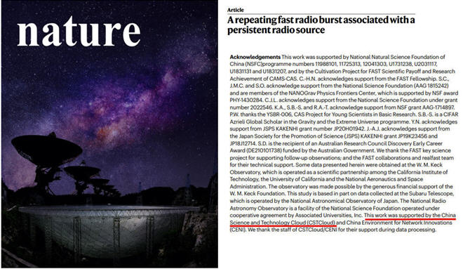 500米口径球面射电望远镜(Five-hundred-meter Aperture Spherical radio Telescope, FAST)是世界最大单口径、最灵敏的射电望远镜,被誉为“中国天眼”。海量观测数据的高速传输、存储与计算,是FAST探索宇宙深处奥秘的关键环节之一。中国科学院国家天文台研究员、FAST首席科学家李菂领导的国际团队,通过FAST发现了迄今为止唯一一例持续活跃的重复快速射电暴FRB 20190520B,该成果已于北京时间2022年6月9日在国际学术期刊《自然》(Nature)上发表。在文章中,特别对中国科技云在数据分析处理方面所做的贡献给予感谢:“This work was supported by the China Science and Technology Cloud (CSTCloud) and China Environment for Network Innovations (CENI). We thank the staff of CSTCloud/CENI for their support during data processing”。