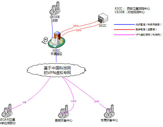 根据卫星任务需求,中国科技云为GECAM卫星集成联网提供了基于中国科技云网络环境建设的IPSEC虚拟专网,连接国家空间科学中心、GECAM科学卫星应用中心(中科院高能所)、地面接收分系统(中科院空天院)、数据灾备中心(昆明、东莞数据中心),为卫星科研数据传输提供高速科研数据专网。并且提供了主备双线、物理隔离的数字专线连接到国家卫星测控系统,为卫星的运行和工作状态进行监视,生成控制指令,虚拟专网链路图如下图所示。
