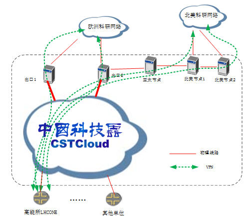2018年3月,依托中国科技云国际互联网络资源,中国科学院高能物理研究所正式开通LHCONE。2019年9月,为提高数据传输效率,中国科技云又开通4条万兆MPLSVPN线路至欧洲科研网GEANT和美国能源科学网ESNET,支持高能物理所接入CERN的LHCONEVPN环境。从而实现了中国科技云网络基础设施与CERN LHCONE虚拟专网的多链路冗余对接。